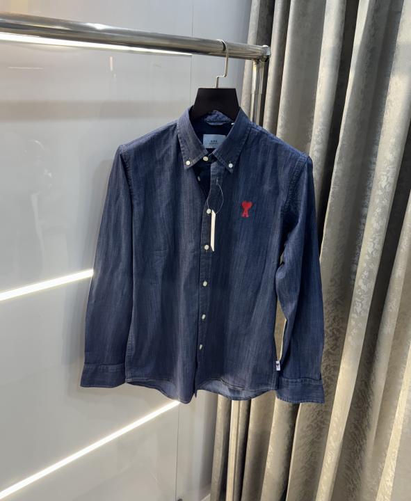 Home Shirts Ami Paris Dark Blue Embroidery Logo Premium Denim Shirt