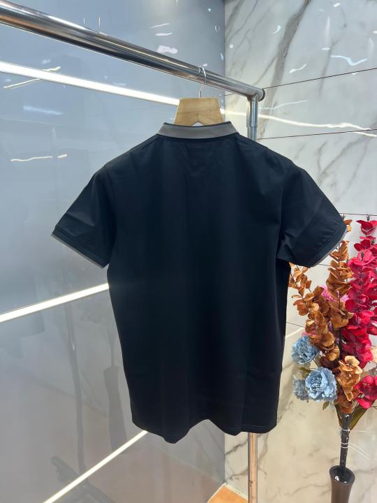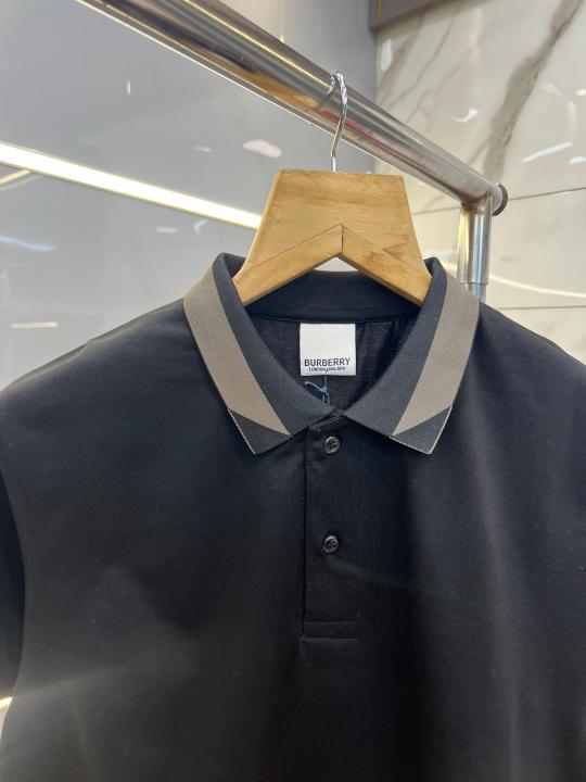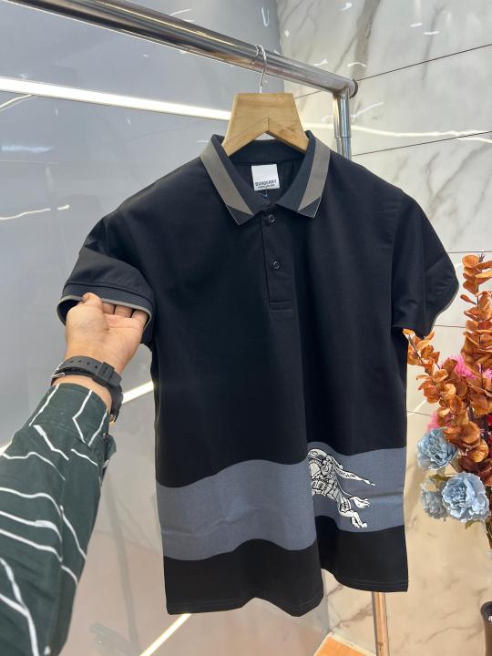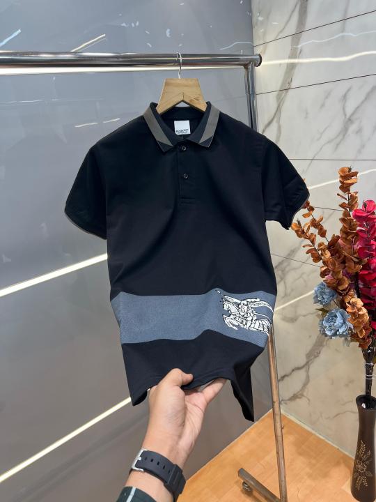 Home T-Shirts Burberr y Black Premium Imported 240 GSM Interlock Lycra Fabric Polo Tshirt with Collar Design and Emboss Logo 4054