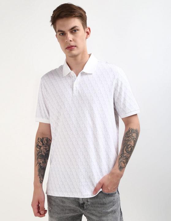 Calvin Klei n White Premium 240 gsm interlock compact cotton fabric Polo Tshirt with Allover Monogram Print 3737