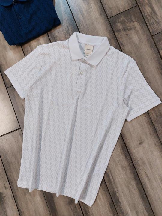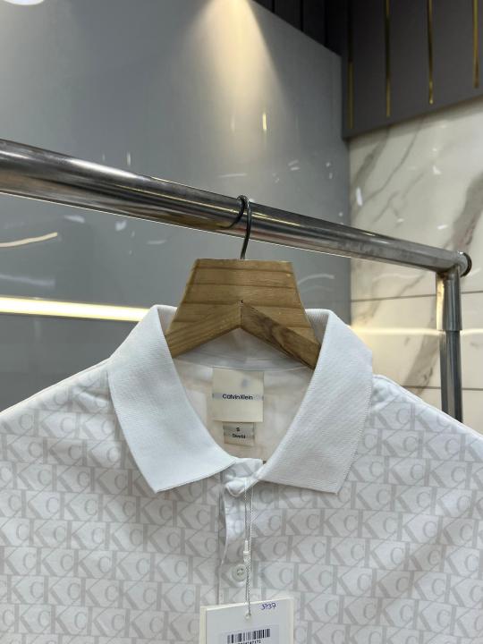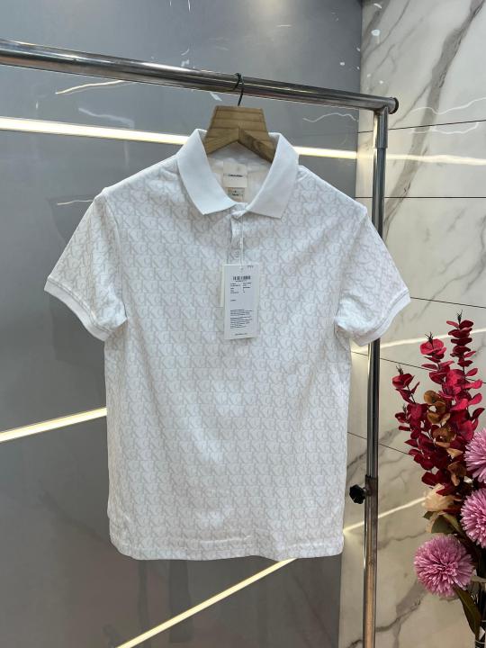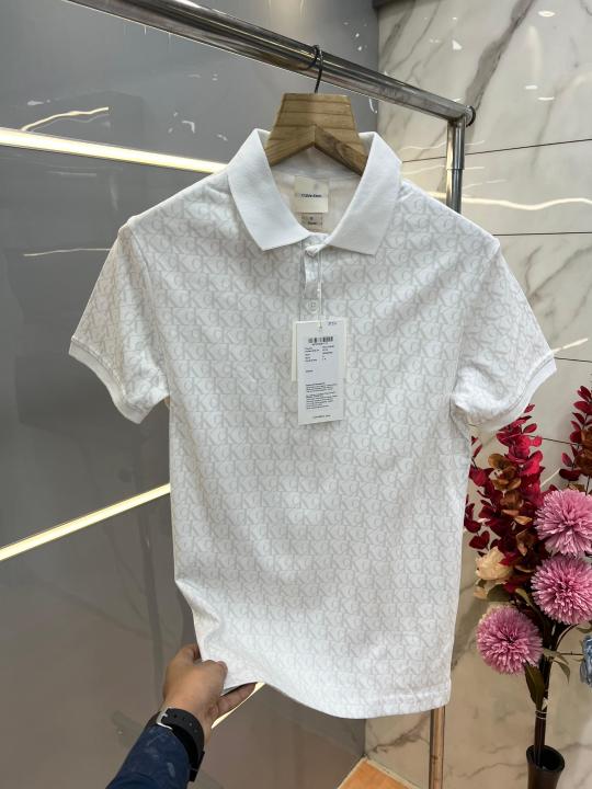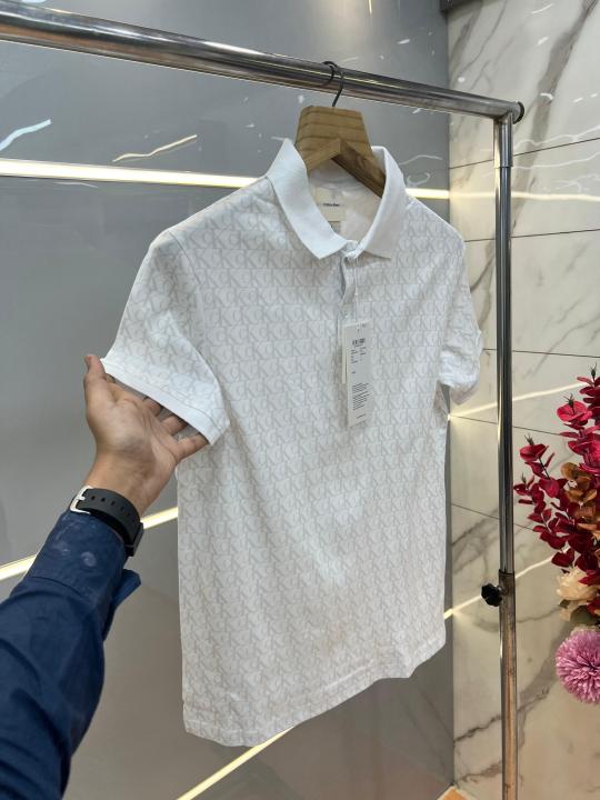 Home T-Shirts Calvin Klei n White Premium 240 gsm interlock compact cotton fabric Polo Tshirt with Allover Monogram Print 3737