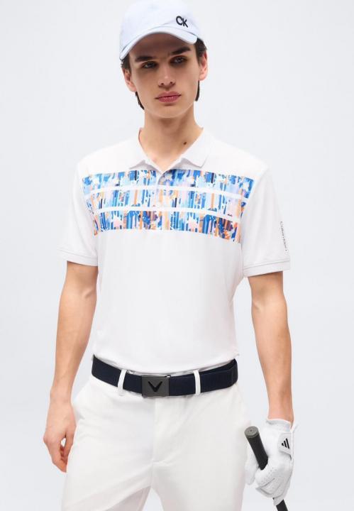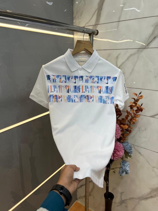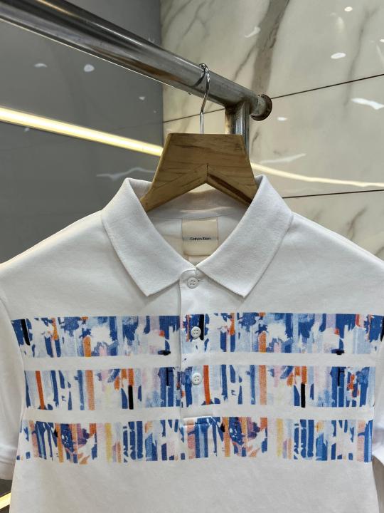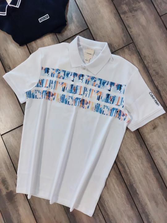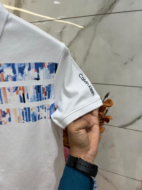 Calvin Klei n White Premium Imported Compact Yarn 240 GSM Interlock Fabric Polo Tshirt with Front Design and Emboss Logo 3930