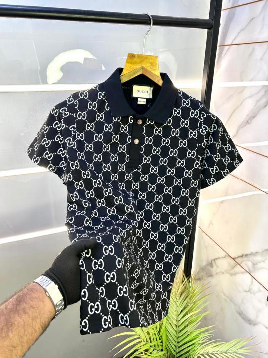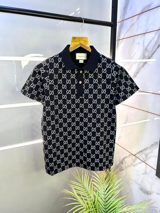 Home T-Shirts Gucc i Black Monogram Imported Polo Neck Premium Collar T-shirt F1856-BL