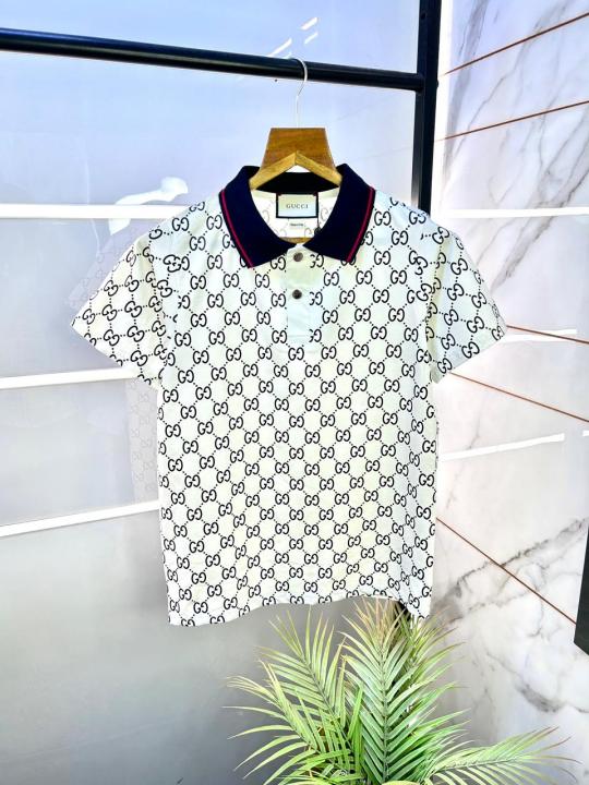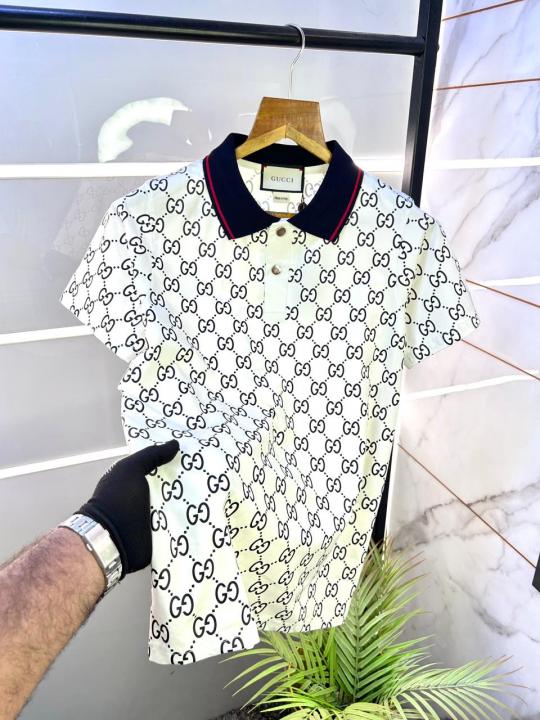 Home T-Shirts Gucc i White Monogram Imported Polo Neck Premium Collar T-shirt F1856-W3