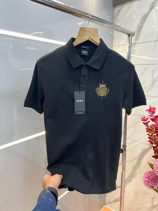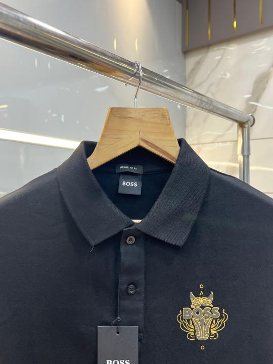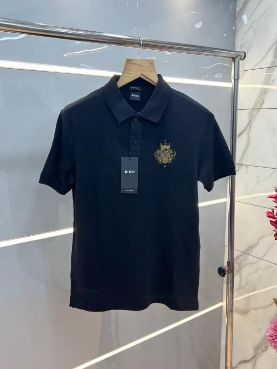 Hugo Bos s Black Premium 240 gsm interlock compact cotton fabric Polo Tshirt with Collar Design and Emboss Logo 3741