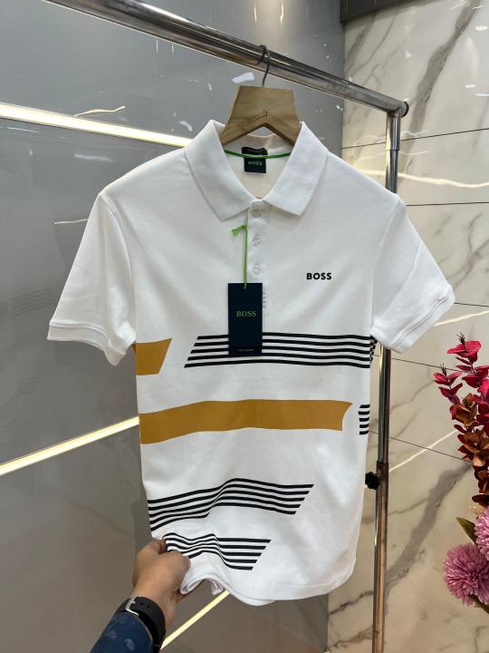 Hugo Bos s White Premium 240 gsm interlock compact cotton fabric Polo Tshirt with Front Design and Emboss Logo 3740