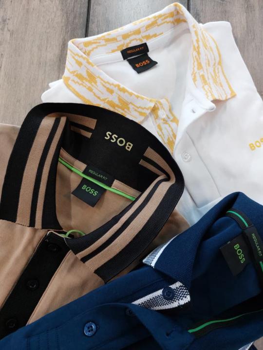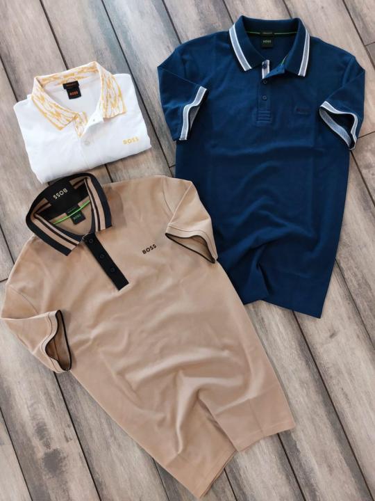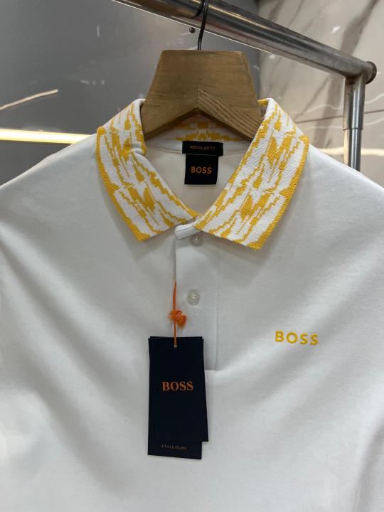 Home T-Shirts Hugo Bos s White Premium Imported Compact Yarn 240 GSM Interlock Fabric Polo Tshirt with Collar Design and Emboss Logo 3352