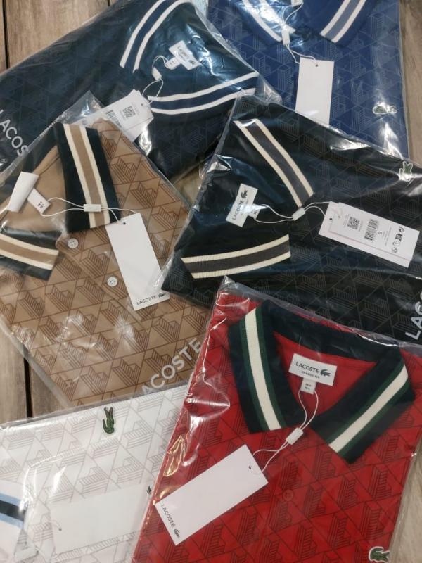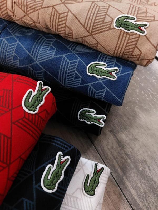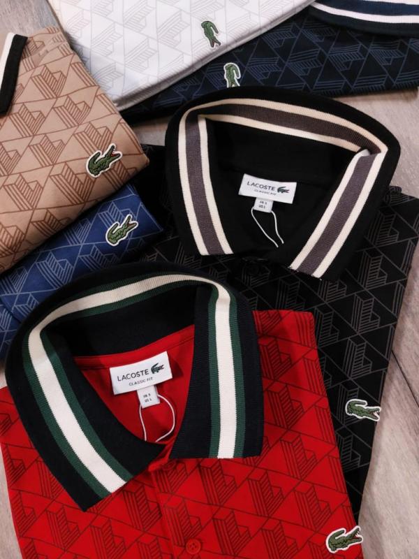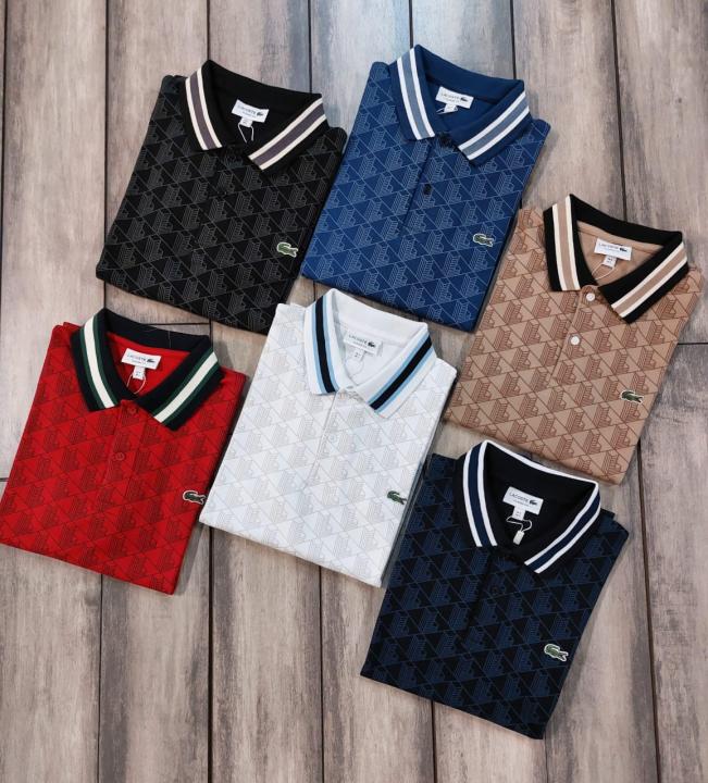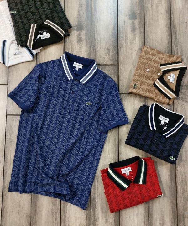 Lacost e Blue Premium 240 gsm interlock compact cotton fabric Polo Tshirt with Allover Monogram Print Collar Design and Embroidered Logo 3591