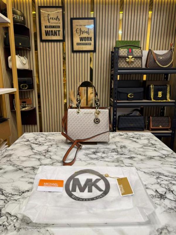 Michael_Kors Cynthia Signature Logo Satchel Bag With Dust Bag (Beige)