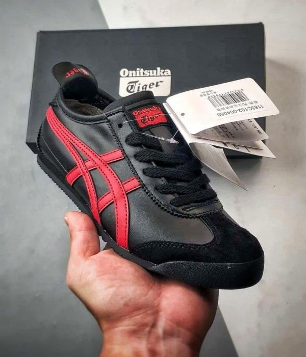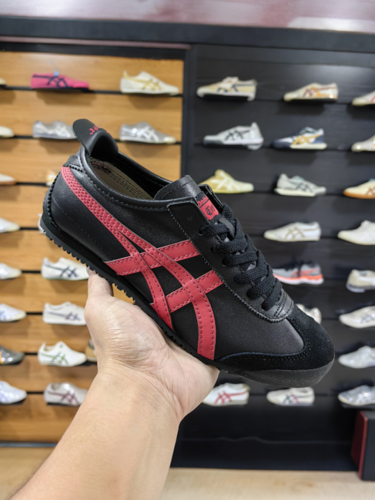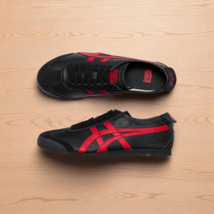 The Onitsuka Tiger Mexico 66 in "Black/Classic Red" is one of the most recognized colorways in the brand's history, famously blending 1960s track aesthetics with a bold, aggressive edge. This 7A Premium Quality (First Copy) replica for men meticulously captures the slim, racing profile and technical heritage of the 1966 "Limber" model. The deep black leather base paired with sharp red Tiger stripes makes it a high-impact choice for casual wear, urban commuting, or making a retro-style statement.