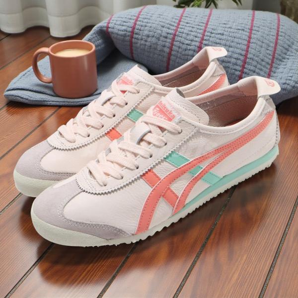 Guava Peach Accents: Features the iconic Tiger stripes in a vibrant yet soft "Guava" orange-pink hue, providing a high-style contrast.