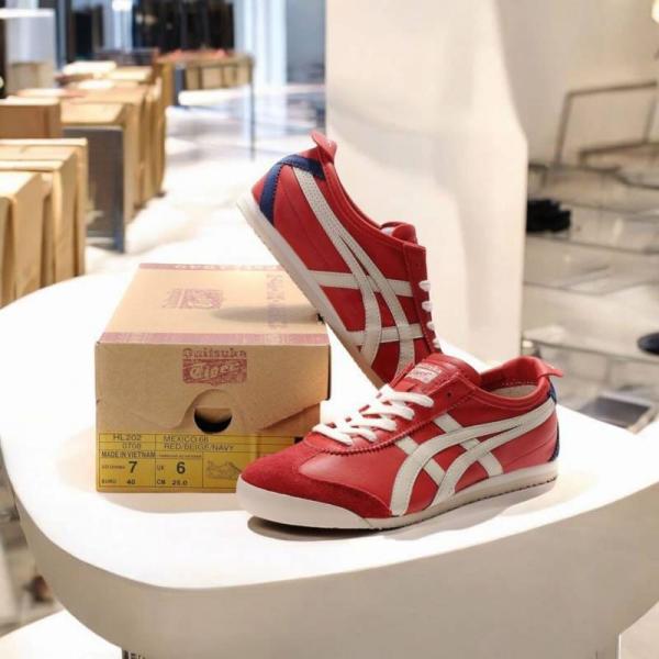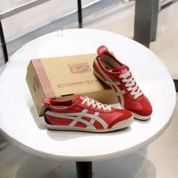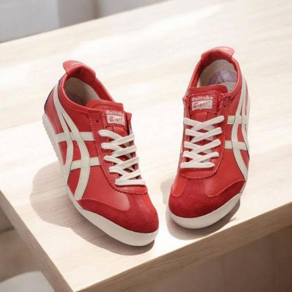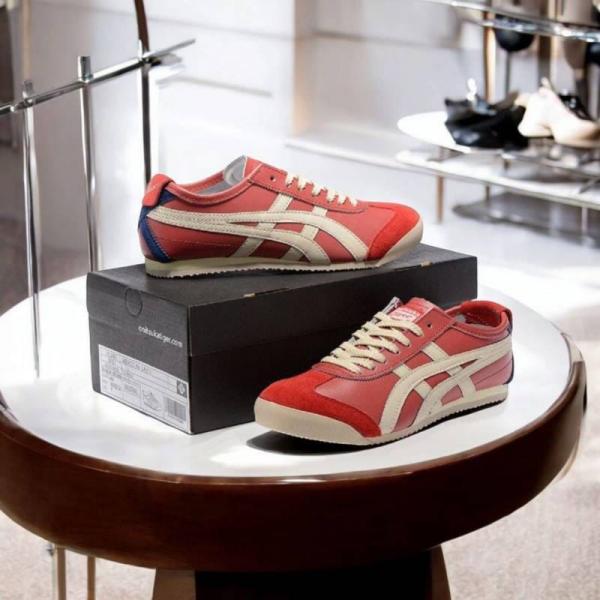 The Onitsuka Tiger Mexico 66 "Red/Beige/Blue" is a vibrant, personality-packed twist on the traditional heritage palette. This 7A Premium First Copy replica features a striking scarlet red leather base contrasted by soft beige (birch) and deep blue Tiger stripes. It is the perfect choice for those who want to pivot away from the common "Tricolor" white base while maintaining the authentic 1960s track-and-field soul.