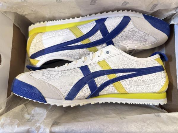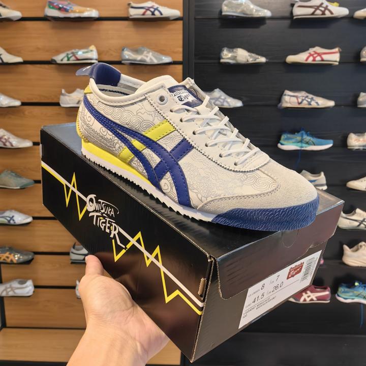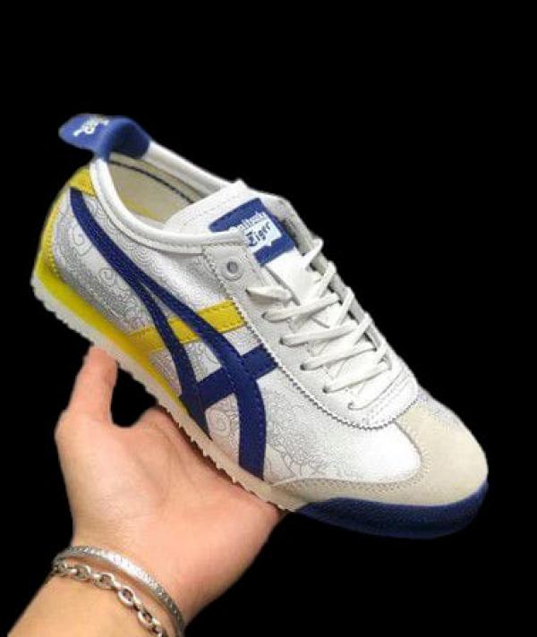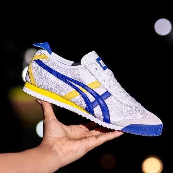 Refined Tricolor Aesthetic: Built on a crisp White upper with Blue Tiger stripes and sharp Yellow details on the heel flap and tongue logo.