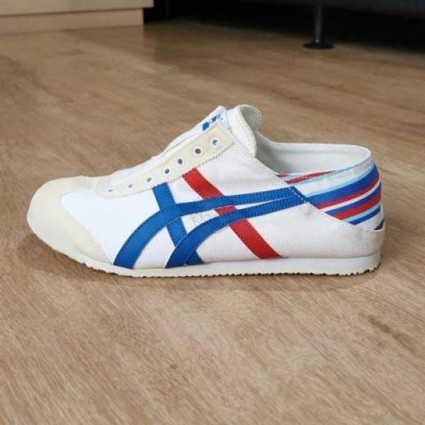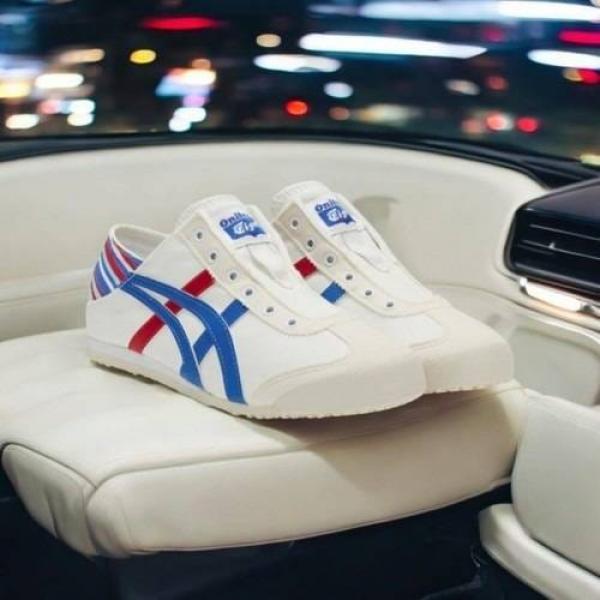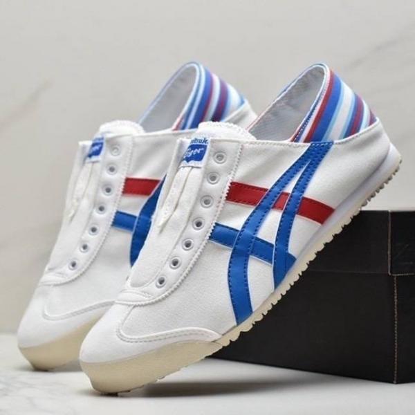 The Onitsuka Tiger Mexico 66 Slip-On in "White/Blue/Red" (Tricolor) is the definitive heritage sneaker for men. This 7A Premium First Copy replica captures the legendary 1966 "Limber" look?the first to feature the iconic Tiger stripes?and updates it with an effortless, laceless construction. Combining a crisp white leather/canvas body with vibrant "Classic Red" and "Directoire Blue" stripes, this pair is a versatile staple for any modern wardrobe.