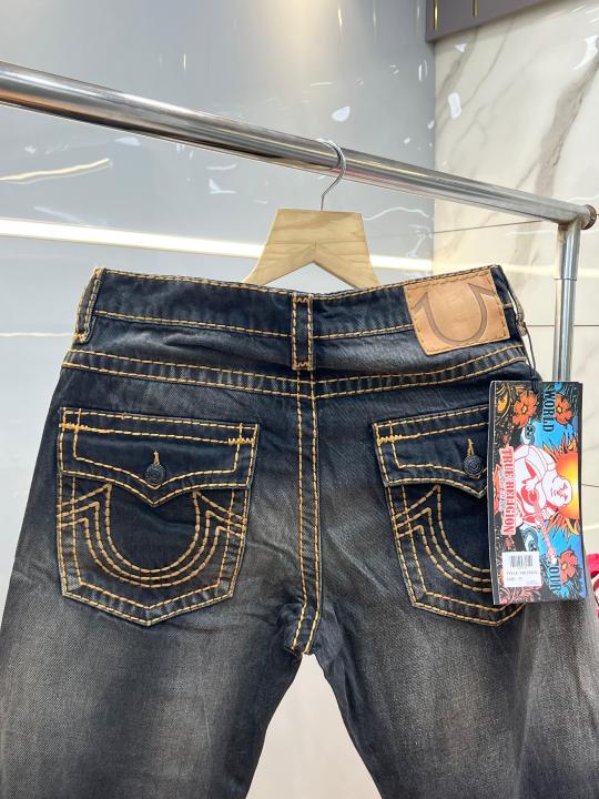 True religion hyperflex blue imported denim with brand button and pattern on back