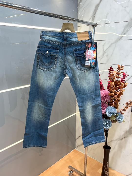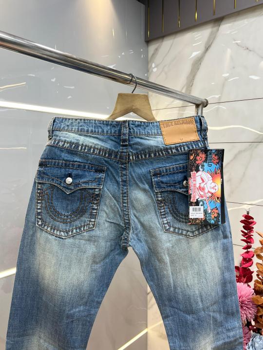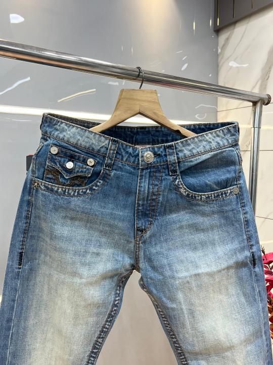 True religion hyperflex blue imported denim with brand button and pattern on back
