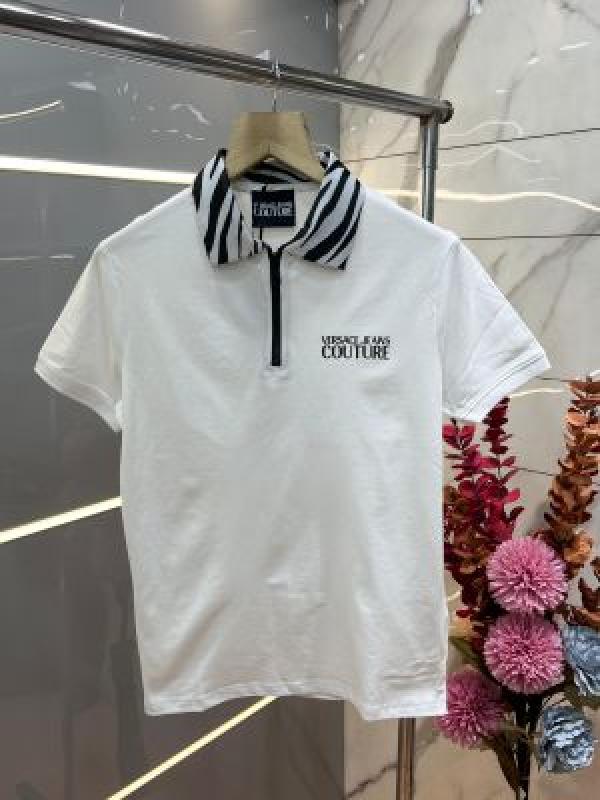 Home T-Shirts Versac e White Premium Cotton Pique fabric Polo Tshirt with Collar Design and Emboss Logo Zip Style 3528