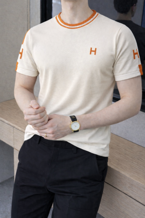 Hermes Logo Imported Off-White knitted Polo Super Premium Round Neck T-shirt F3528-OF